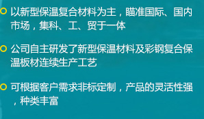 公司是一家瞄準國際、國內市場,集科、工、貿于一體的綜合性公司,擁有各類先進的設備100余臺(套),公司自主研發(fā)了新型保溫材料及彩鋼復合保溫板材連續(xù)生產工藝,建成了機上一次成型彩鋼復合保溫板材的生產線...